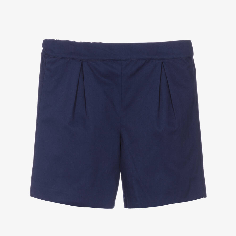 Smart-casual navy blue cotton shorts for boys by classic British designer Beatrice & George, exclusive to Childrensalon. Ideal for warmer days, they are made in lightweight twill with inverted pleat detailing on the front. Lined in voile for comfort, they have a semi-elasticated waistband with an adjustable waistband for a great fit.
