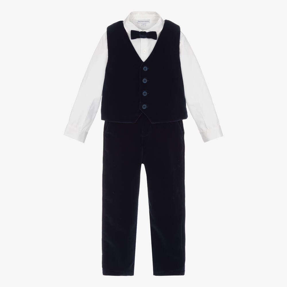 Navy blue waistcoat suit and bow tie set for boys in luxurious velvet by British brand Beatrice & George, exclusive to Childrensalon. Ideal for a special occasion, the smart white poplin shirt has branded button fastenings on the front and cuffs, and comes with a detachable, button-fastening, velvet bow tie. The waistcoat has a velvet front and a beautiful satin jacquard back, patterned with the designer's monogram logo for a stylish touch. The coordinating velvet trousers have a matching satin lining and a useful, adjustable waist for a good fit. On the front there are slanted pockets with a button and zip fastening, whilst there are faux pockets on the back.