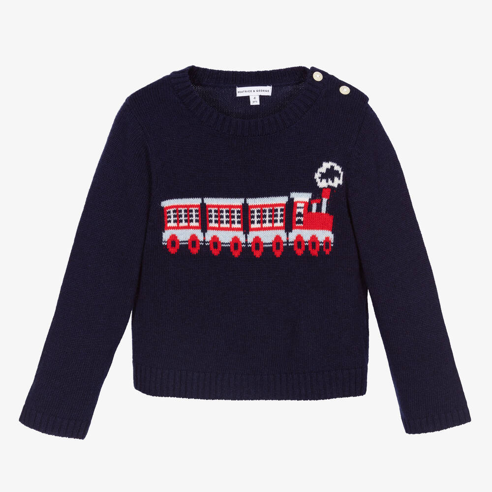 Little boys navy blue sweater by British heritage brand Beatrice & George. Exclusive to Childrensalon, it is knitted in a soft cashmere and Merino wool blend, with a red intarsia train across the front. It has long sleeves, cosy, ribbed trims and useful button fastenings on one shoulder.