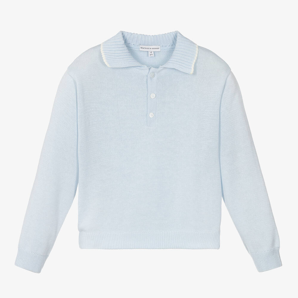 Exclusive to Childrensalon, a long-sleeved pale blue Henley sweater for boys by traditional brand Beatrice & George. Knitted in soft, lightweight cotton, it has white tipping on the ribbed collar, front button fastenings and cosy, finely ribbed trims.