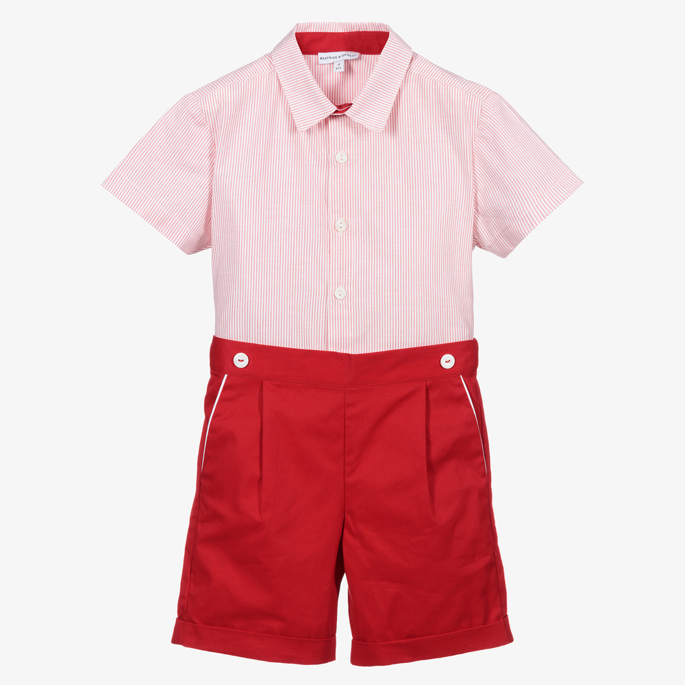 Exclusive to Childrensalon, a smart cotton shorts set for little boys by traditional brand Beatrice & George. The short-sleeved shirt is made in lightweight poplin, striped in red, and fastens with buttons on the front. The red shorts have white piping on the slanted front pockets and a useful, adjustable, semi-elasticated waist for a good fit. The cuffs have stylish, fixed turn-ups.