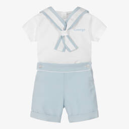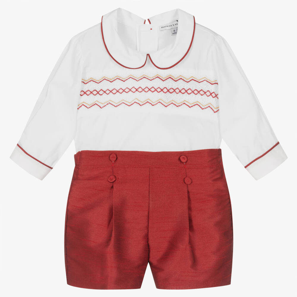 Exclusive to Childrensalon, a special occasion shorts set for little boys by classic British designer Beatrice & George. Timeless and traditionally styled, the white cotton shirt has beautiful hand smocking on the front, with burgundy red and beige hand embroidery. With piped burgundy red trims, it has logo button fastenings on the back, along with two fabric-covered buttons on the front to attach to the shorts, ensuring the shirt stays neatly tucked in. The burgundy red, cotton-blend shorts have smart, inverted pleats with decorative button detailing. They are fully lined in voile with an elasticated waistband on the back for a comfortable fit.