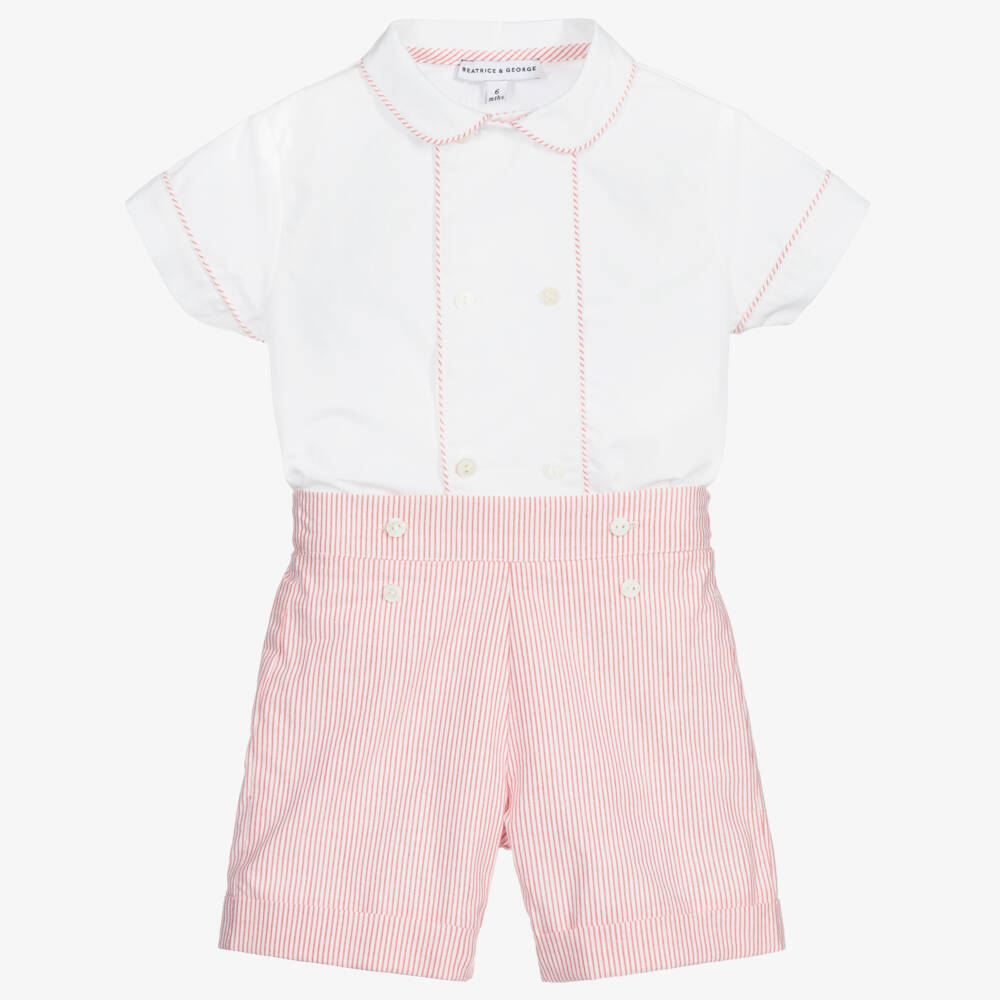 Smart traditional cotton shorts set for boys from British heritage brand Beatrice & George, exclusive to Childrensalon. The lightweight poplin shirt has red and white striped piping and fastens with buttons on the front. The coordinating, striped shorts are lined for comfort and have a useful, adjustable, semi-elasticated waist for a great fit. The shirt buttons onto the shorts so will always stay neatly tucked in.