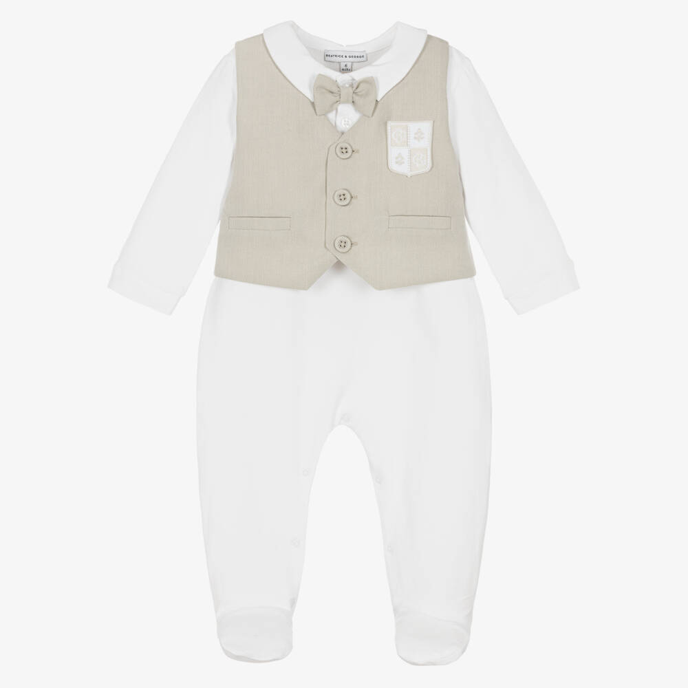 Exclusive to Childrensalon, a smart white cotton babygrow for boys by traditional brand Beatrice & George. With the appearance of a two piece, it has a beige herringbone waistcoat overlay with an embroidered crest logo on the front, faux front pockets and button fastenings. The comfortable jersey babygrow below has an attached beige bow tie on the neckline, branded button fastenings on the front and popper fastenings between the legs for speedy dressing.