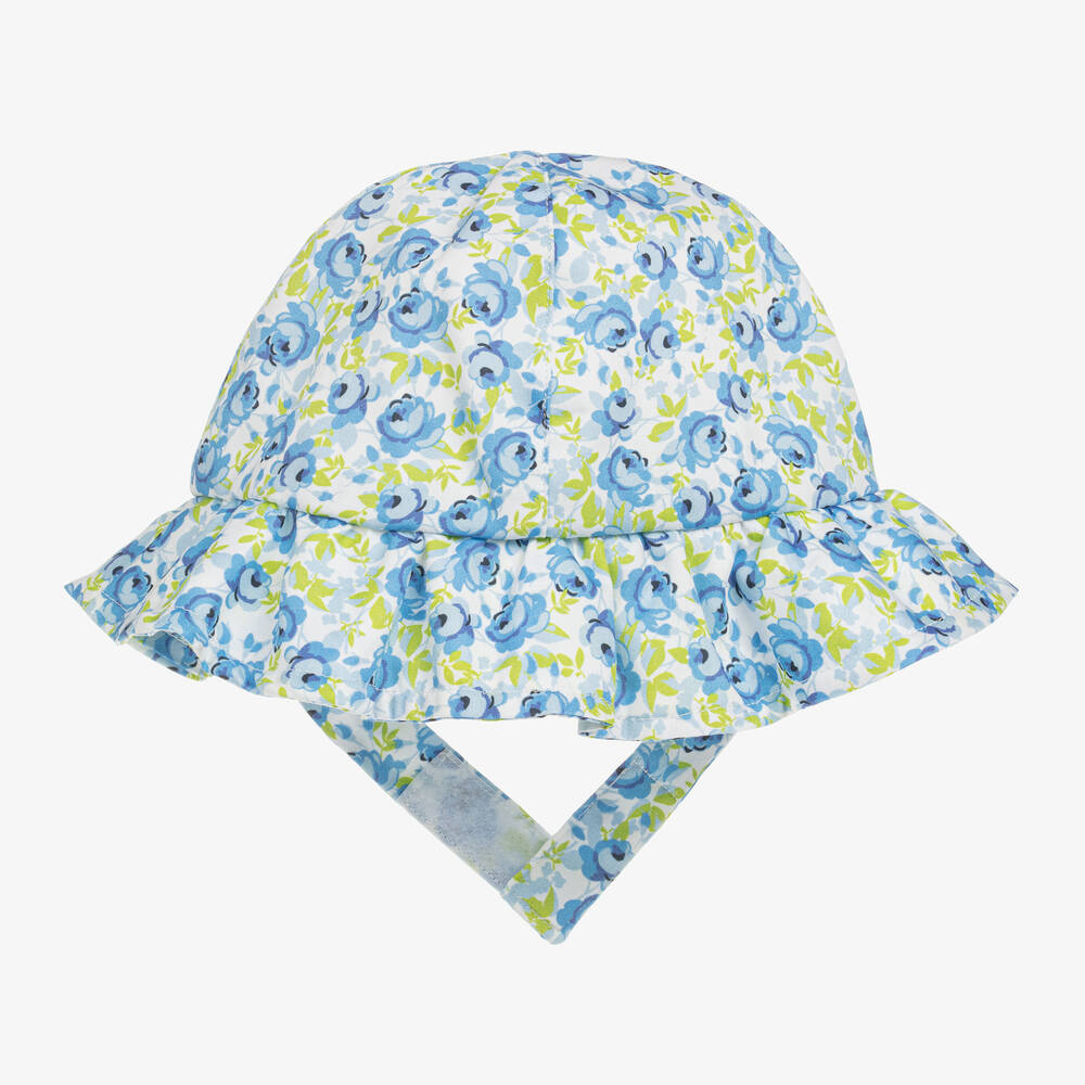 Lovely cotton hat for girls by British designer Beatrice & George, exclusive to Childrensalon. Ideal for sunny days, the hat is made in cool, lightweight poplin with a pretty blue and green rose print on a white background. It is fully lined in lightweight voile for comfort and has useful, velcro-fastening straps on smaller sizes.