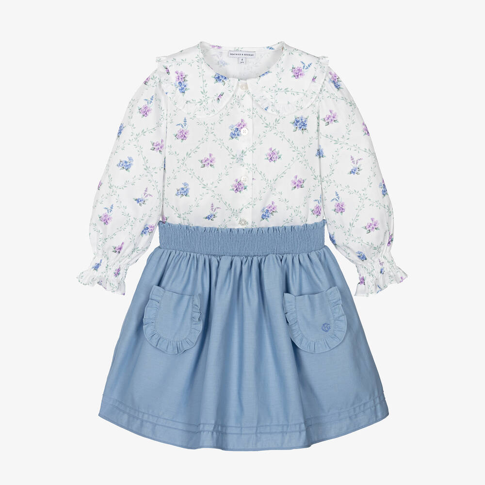 Exclusive to Childrensalon, a pretty blouse and skirt set for girls by British heritage brand Beatrice & George, with frilly trims and shirred detailing. The white cotton blouse has a lovely green floral trellis pattern, with blue and pink flowers. The blue linen and cotton blend skirt has cute front pockets, and is full and gathered, with pin-tuck detailing around the hemline. Easy to wear, it simply pulls up.