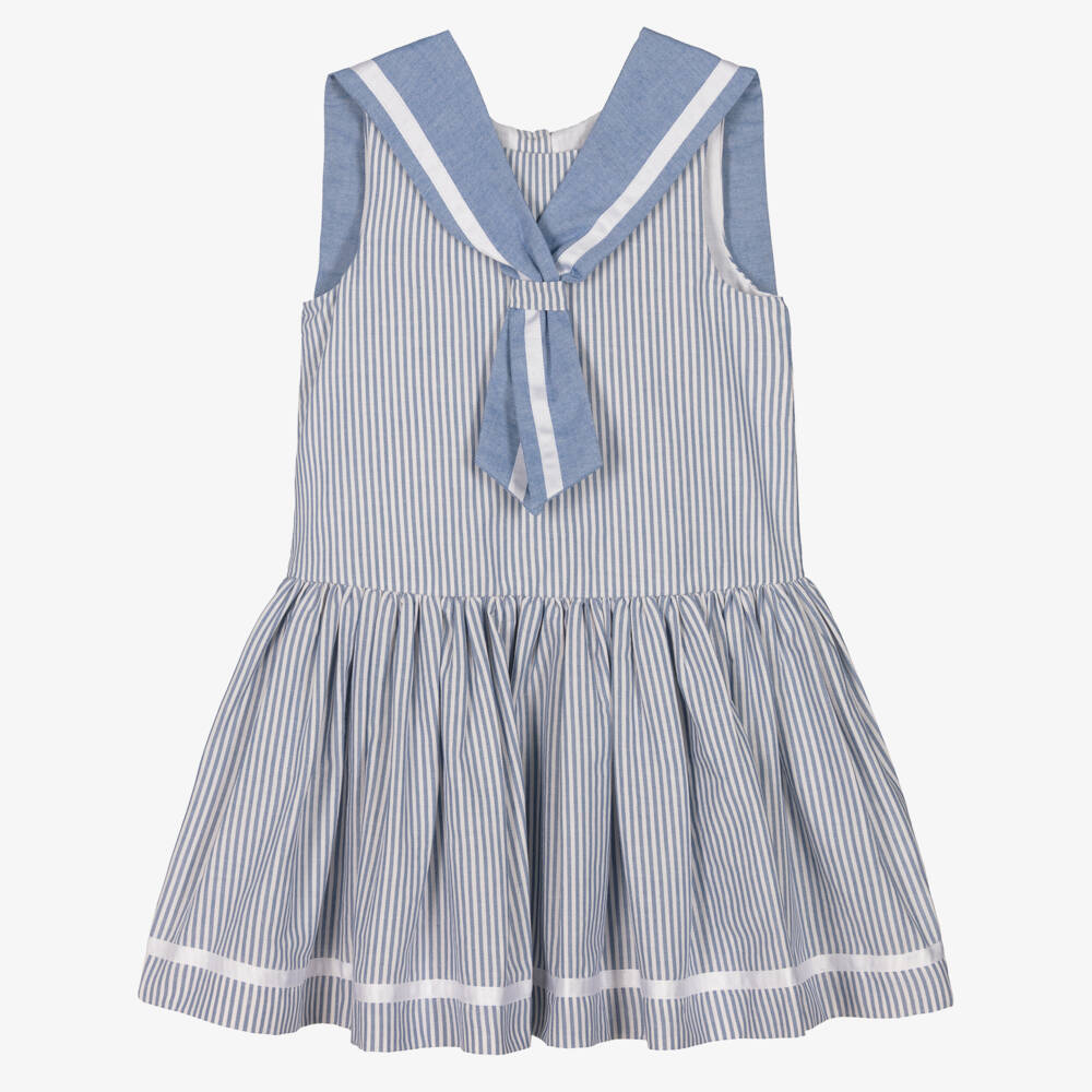 Blue and white striped Oxford cotton dress for girls by British heritage brand Beatrice & George, exclusive to Childrensalon. With a traditional, sailor-style collar trimmed in white grosgrain ribbon, it has a full, gathered skirt and branded button fastenings on the back. The bodice is lined in lightweight cotton voile for comfort.