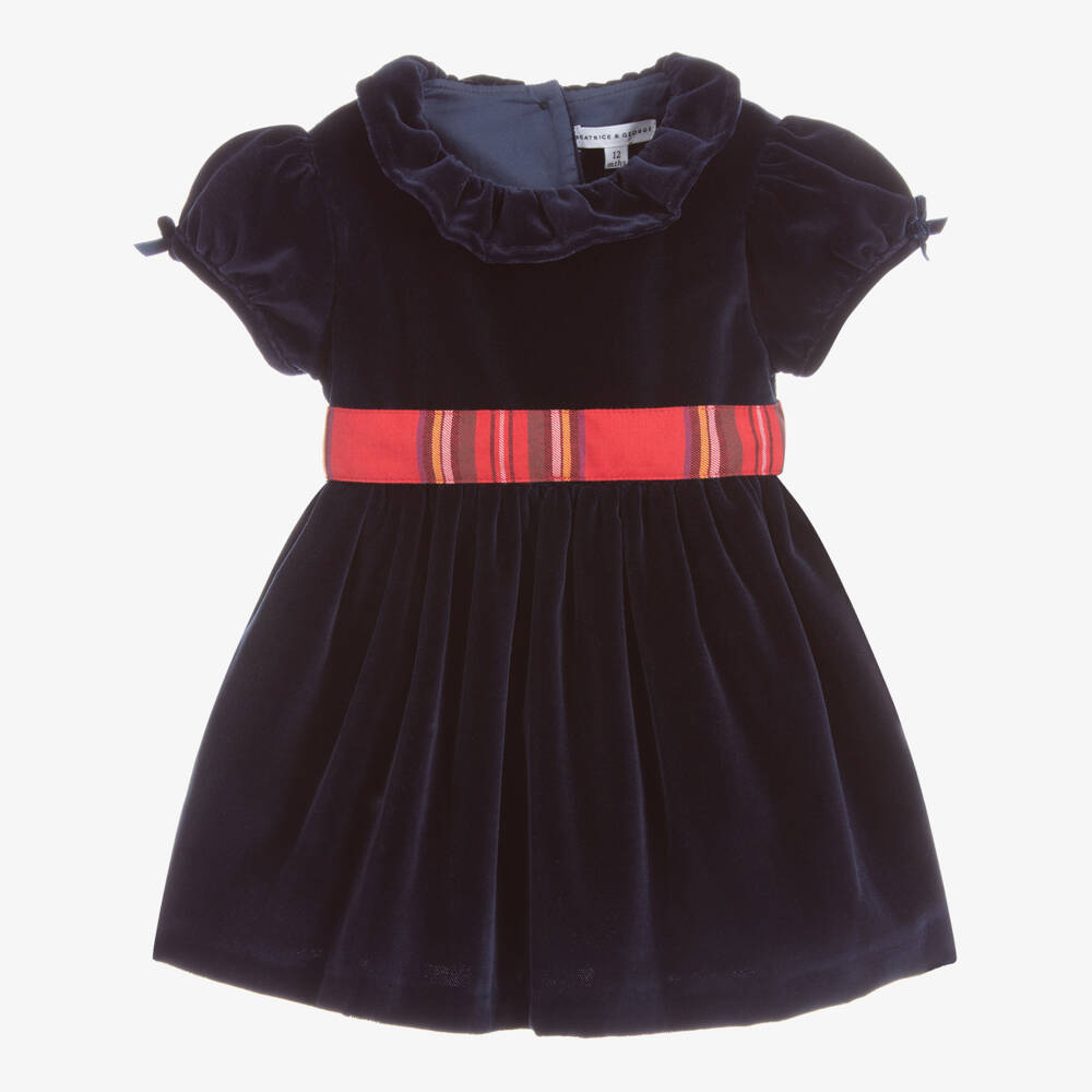 Exclusive to Childrensalon, this charming navy blue cotton velvet dress for little girls is by British heritage brand Beatrice & George. It has a pretty ruffled collar, puffed sleeves trimmed with bows and a red tartan sash that ties in a bow on the back. The dress fastens with velvet-covered buttons, is fully lined in comfortable cotton and comes with useful velvet bloomers to match.