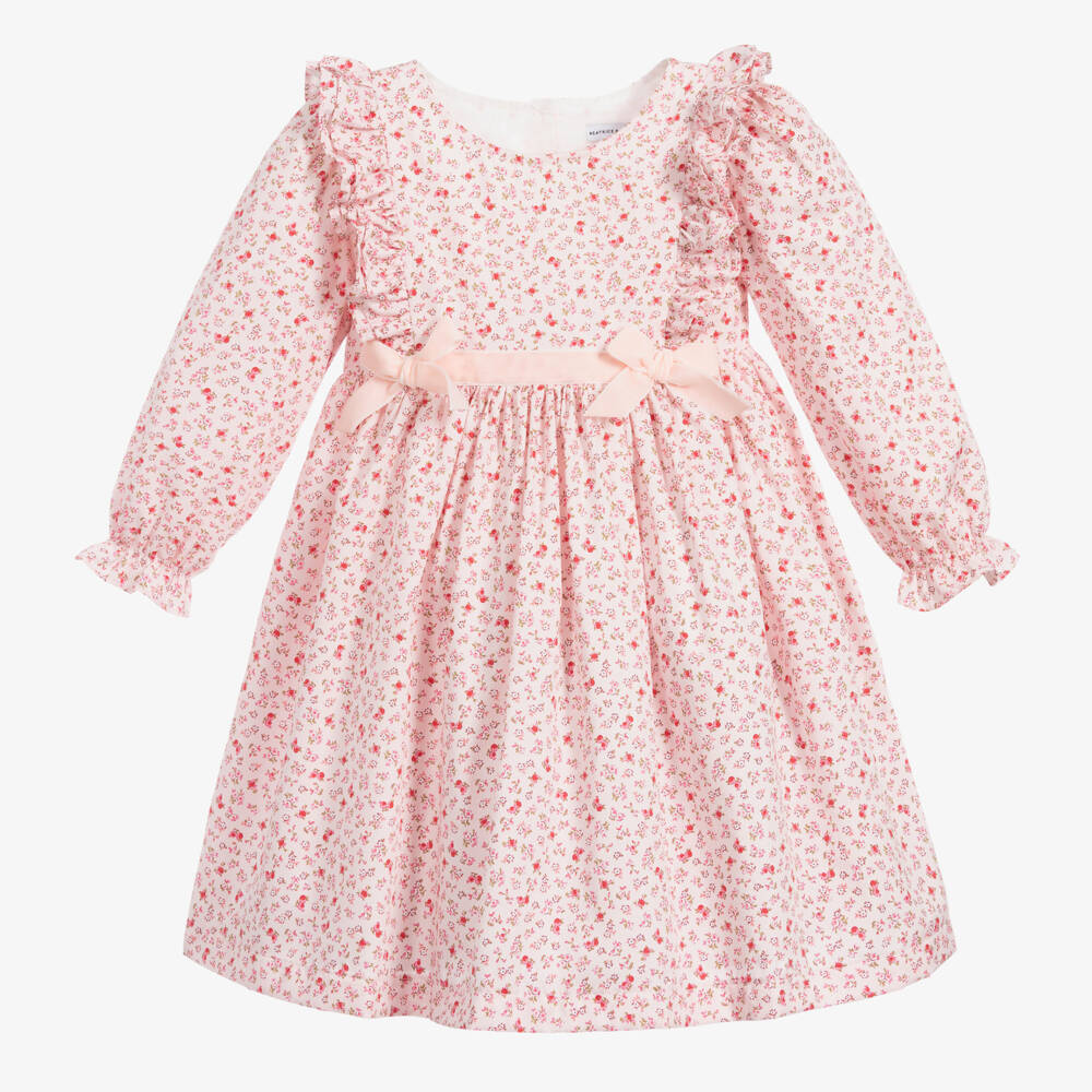 Exclusive to Childrensalon, a pretty pink floral dress for girls by British heritage brand, Beatrice and George. Made and lined in soft cotton, it has ruffles over the shoulders and cuffs, with a pink velvet trim with bows on the front of the waistline.