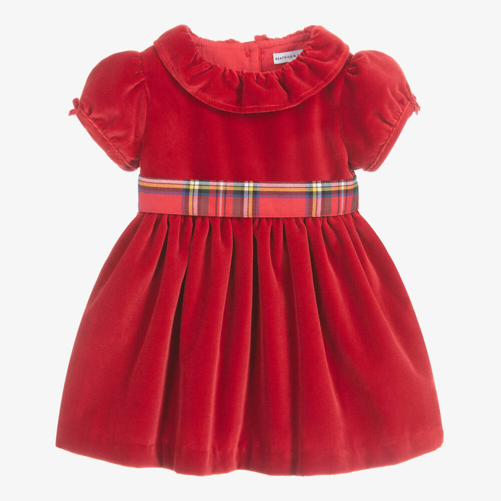 Exclusive to Childrensalon, this charming red cotton velvet dress for little girls is by British heritage brand Beatrice & George. It has a pretty ruffled collar, puffed sleeves trimmed with bows and a red tartan sash that ties in a bow on the back. The dress fastens with velvet-covered buttons, is fully lined in comfortable cotton and comes with useful velvet bloomers to match.