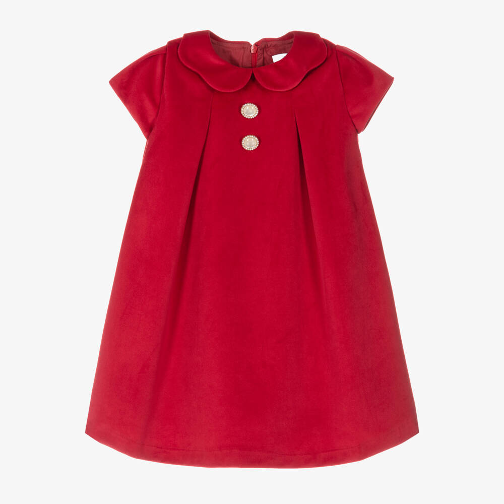 Gorgeous red special occasion dress for girls by British heritage brand Beatrice & George, exclusive to Childrensalon. Made in super soft, luxurious velvet, it has a pretty, scalloped collar with decorative pearl bead buttons sewn below, edged in sparkling diamantés. There are pleats on the capped sleeves and inverted pleats on the front and back for extra fullness.