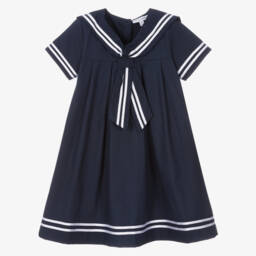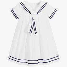 White cotton sailor dress for girls by British heritage brand Beatrice & George, exclusive to Childrensalon. Traditionally styled, it is made in soft poplin and has a sailor collar trimmed in navy blue grosgrain ribbon, with matching trims on the sleeves and hem. The dress has a full skirt, with pretty, inverted pleats all around. It fastens with buttons on the back.