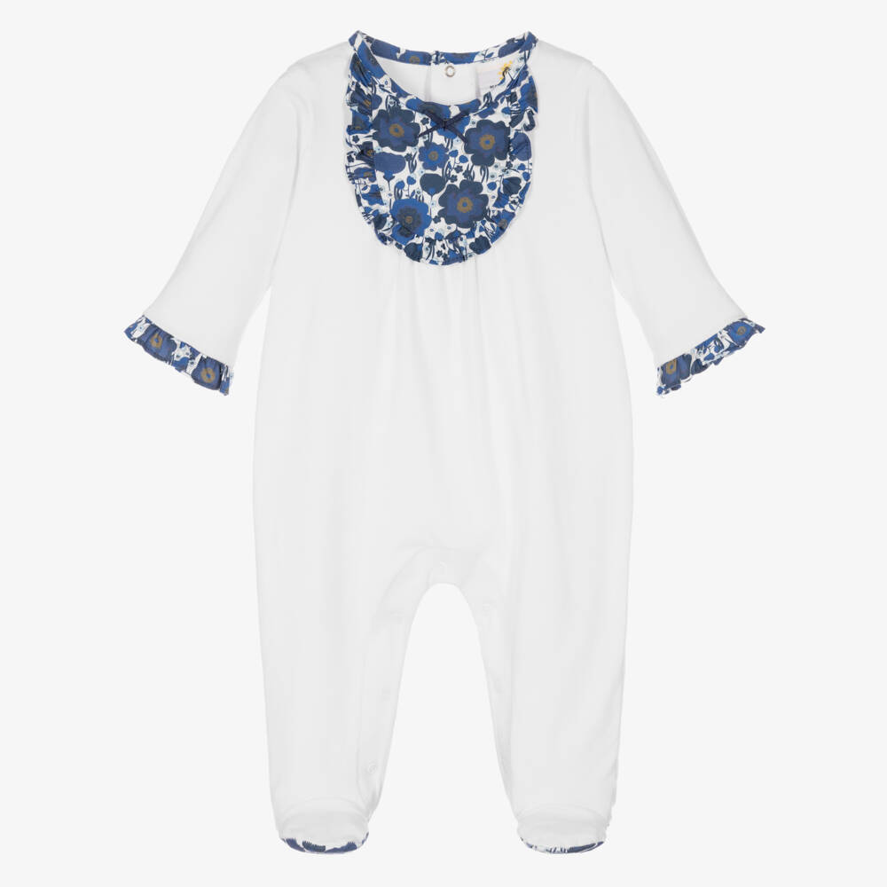 White cotton babygrow for girls by traditional British designer Beatrice & George, designed to celebrate Childrensalon's 70th Anniversary. It has a frilled poplin bib front that has the lovely blue floral Sybil print, created as a heartfelt tribute to the Childrensalon founder, with matching frilly cuffs and feet. It is made in super comfortable, soft brushed jersey and fastens with poppers on the back and between the legs.