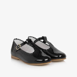 Shiny white T-bar shoes for girls by traditional British brand Beatrice & George, exclusive to Childrensalon. Made in soft, supple, patent leather, they are patterned with pretty perforations and have sweet scalloped trims. They have an adjustable ankle strap, fastening with a gold-tone buckle, and a cushioned insole for comfort.