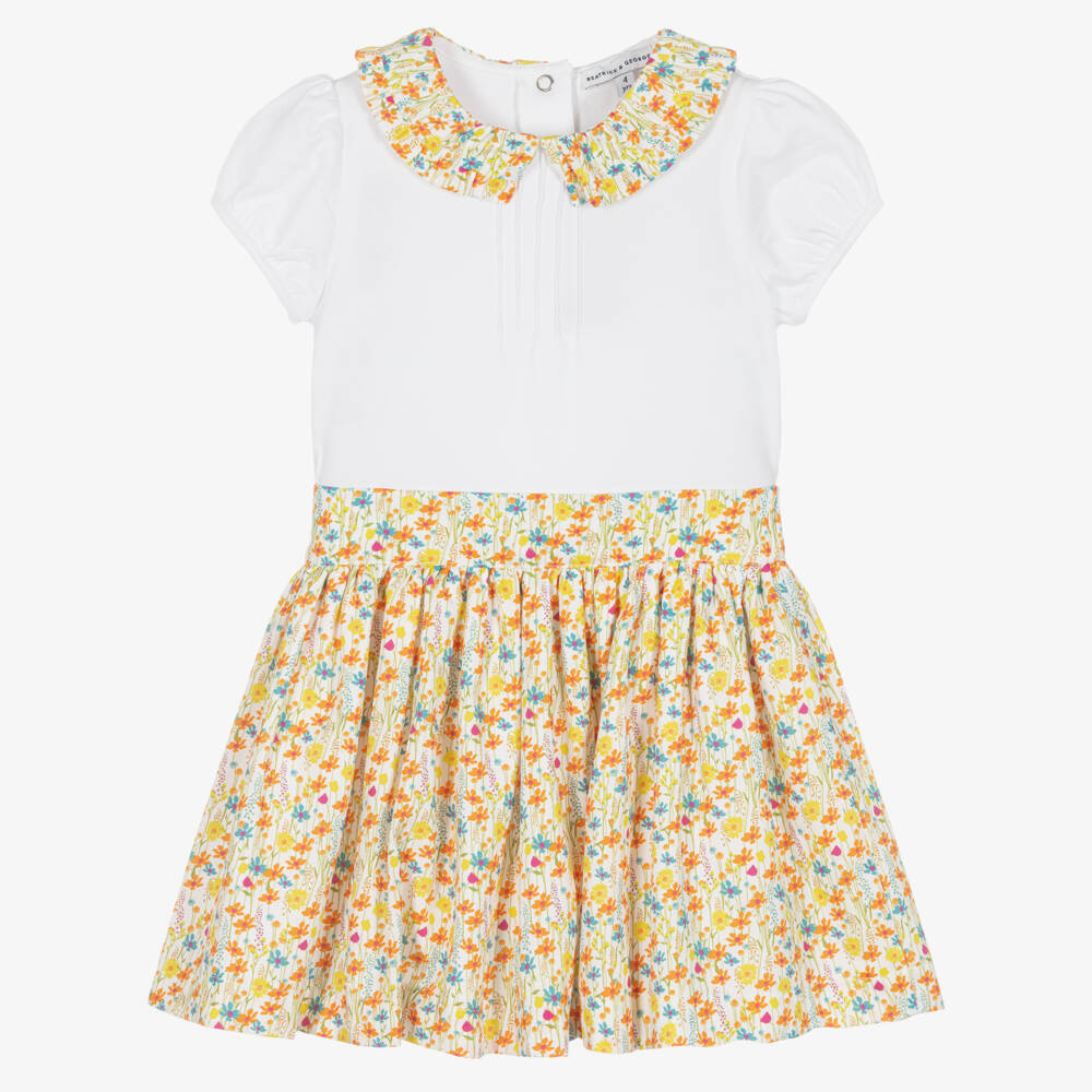 Sweet, summery cotton skirt set for girls by British brand Beatrice & George, exclusive to Childrensalon. The super soft, white jersey T-shirt has a frilled, cotton poplin collar with a lovely yellow, orange and blue floral meadow print. There are little pin tucks on the bodice, prettily puffed, short sleeves and popper fastenings on the back. The coordinating, full, gathered skirt has a matching meadow print, a cotton voile lining for comfort and is easy to wear, simply pulling up.