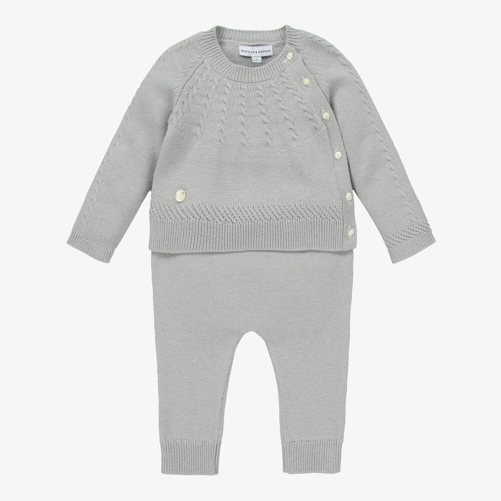 Pale grey two-piece trouser set for little boys and girls by British heritage brand Beatrice & George. Classically styled and exclusive to Childrensalon, the outfit is knitted in a soft cotton and wool blend. The sweater has a cable-knit pattern, a pretty logo charm sewn on the front, and button fastenings on one shoulder and down one side. The matching trousers have ribbed cuffs and a comfortable, elasticated waistband.
