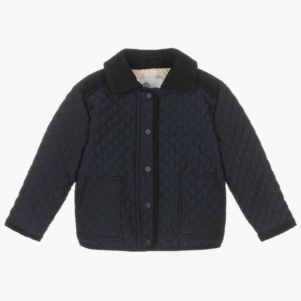 Smart-casual quilted navy blue jacket for boys and girls by traditional British brand Beatrice & George. Exclusive to Childrensalon, it is smooth and silky, with a corduroy collar, shoulders and trims. On the front it fastens with easy-to-use poppers and has useful patch pockets. It has an ivory satin lining for comfort, patterned with jacquard monogram logos.