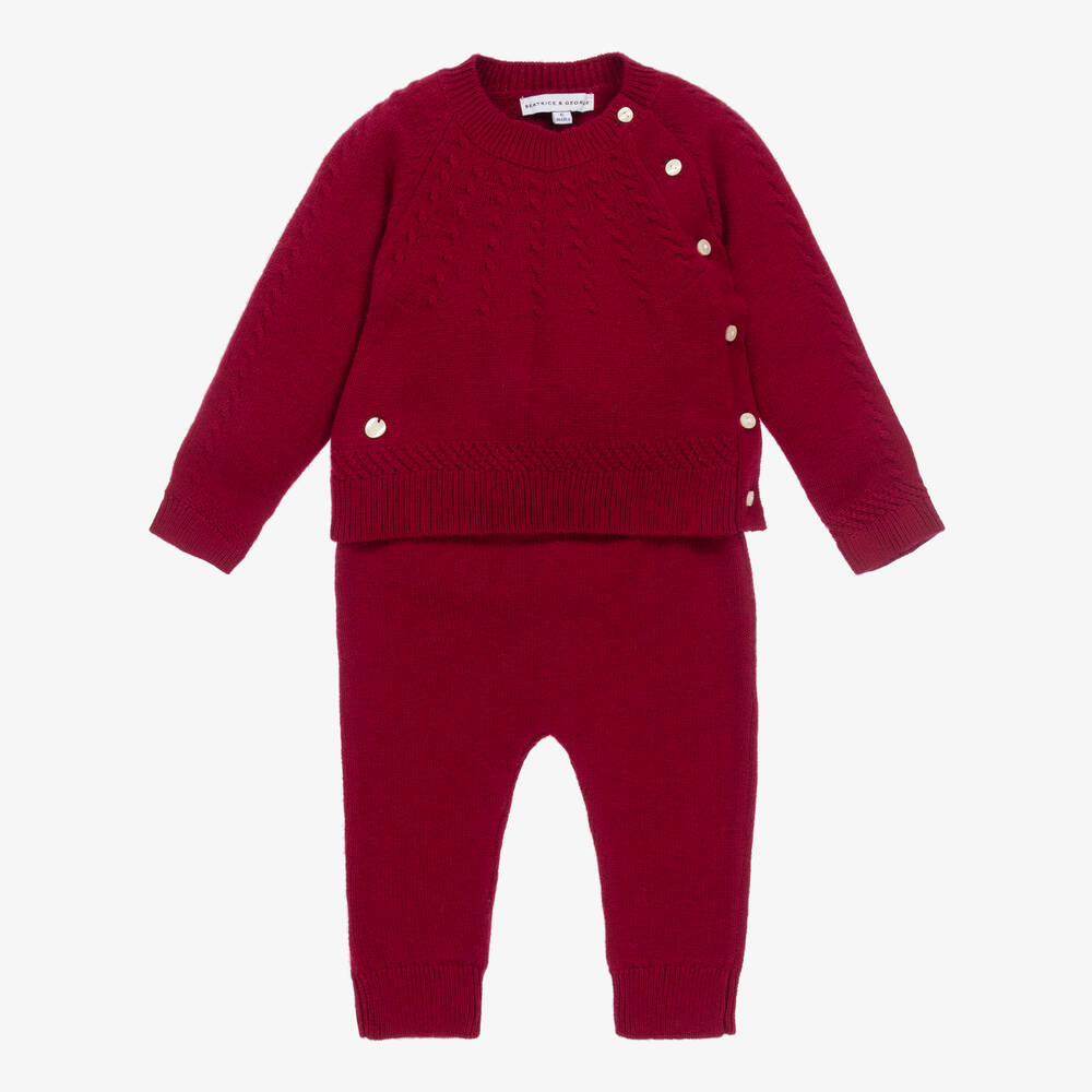 Red two-piece trouser set for little boys and girls by British heritage brand Beatrice & George. Classically styled and exclusive to Childrensalon, the outfit is knitted in a soft cotton and wool blend. The sweater has a cable-knit pattern, a pretty logo charm sewn on the front, and button fastenings on one shoulder and down one side. The matching trousers have ribbed cuffs and a comfortable, elasticated waistband.