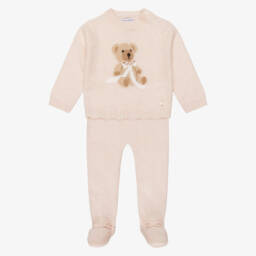 Exclusive to Childrensalon, a white cotton babygrow and bib set for boys and girls by British heritage brand Beatrice & George. The soft, comfortable jersey babygrow has a sweet poplin ruffle around the neckline that extends down one leg. The ruffle covers the popper fastenings, which make dressing and nappy changes quick and easy. It comes with a lined poplin bib that has a beautiful, hand-embroidered monogram logo on the front, surrounded with flowers.