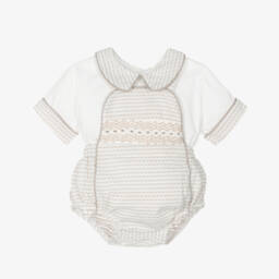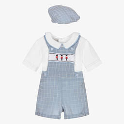 A pale blue dungaree set for baby boys by Beau KiD, woven in lightly ribbed cotton. Lined on the front, the dungaree style shorts have a traditional smocked panel and adjustable shoulder straps. They are gently elasticated for comfort, with poppers between the legs for fuss-free changing. The coordinating top has a smart collar and button fastenings on the back.