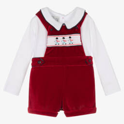 Ivory and beige cotton dungaree set for baby boys by Beau KiD, made with coordinating, lightly textured fabric. The short-sleeved shirt has matching beige piping and button fastenings on the back. Partly lined, the dungaree shorts have an interwoven pattern with beautiful smocking on the front and adjustable shoulder straps that button on the back. The waistband is comfortably elasticated and poppers between the legs help with changing.