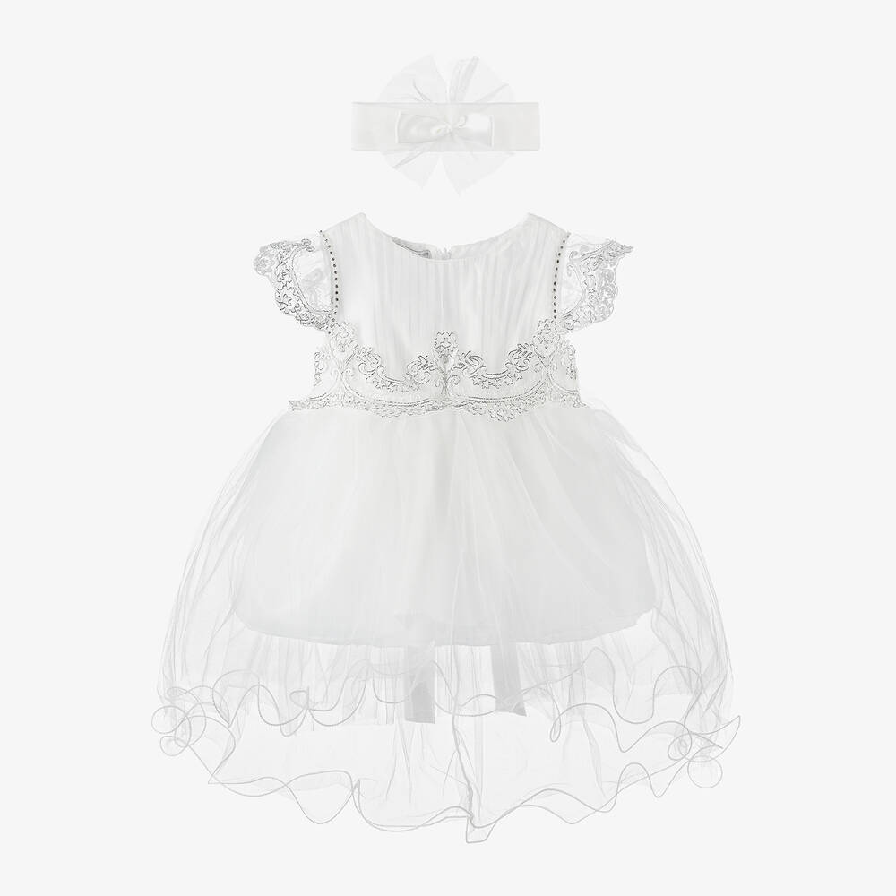 Baby girls ivory special occasion dress and headband set by Beau KiD. The bodice is in satin lined tulle with silver and ivory lace. The skirt is slightly longer on the back with layers of stiffened tulip edged tulle. The stretchy jersey headband is decorated with a bow and tulle.