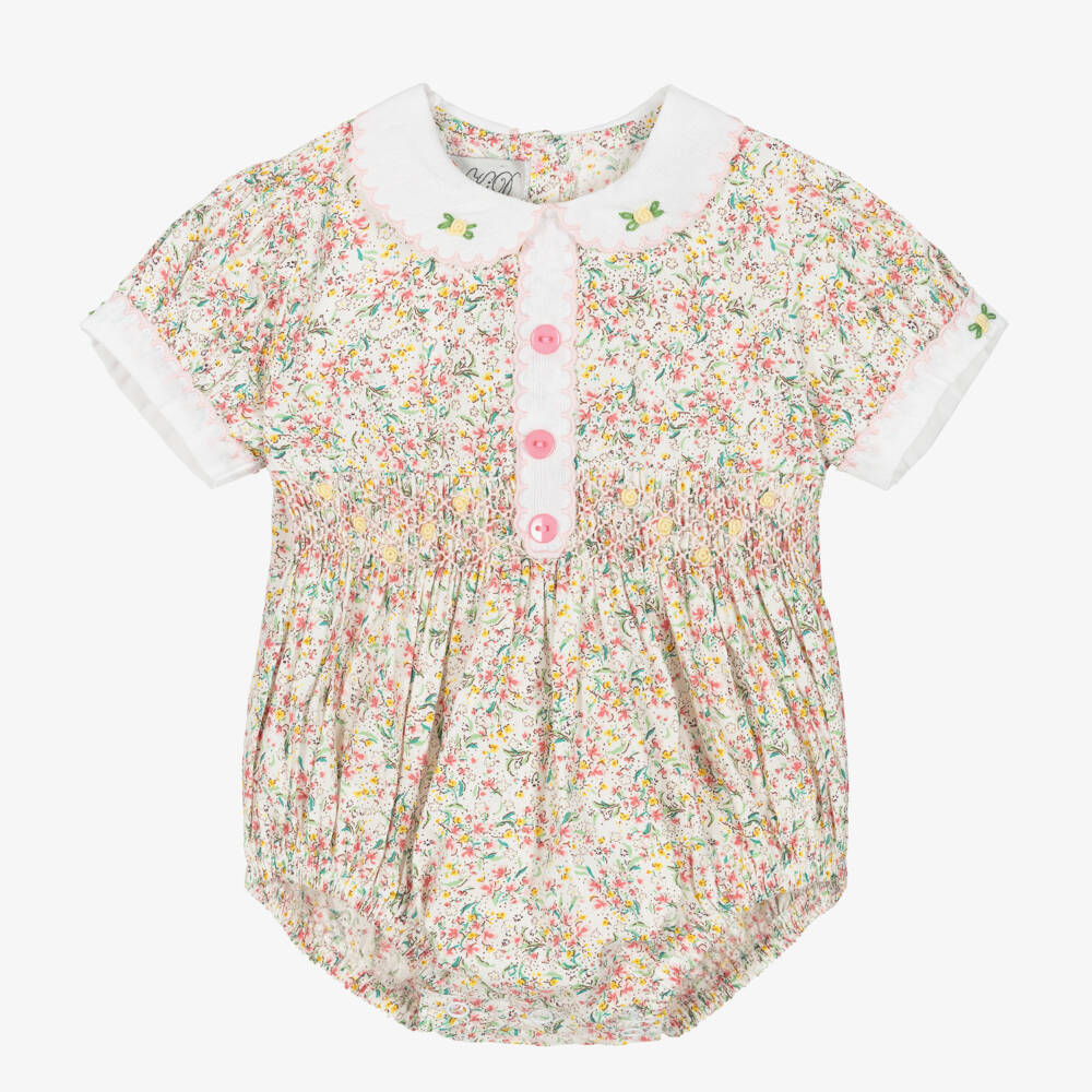 White shortie for baby girls by Beau KiD, with a pretty floral pattern in pink, green and yellow. Made in smooth cotton poplin, it has a scalloped collar and cuffs with yellow embroidered roses, and a faux button placket with pink decorative buttons. There is traditional smocking detail across the waist, with matching embroidered roses. This delightful babysuit fastens with buttons on the back and with poppers between the legs for easy dressing.