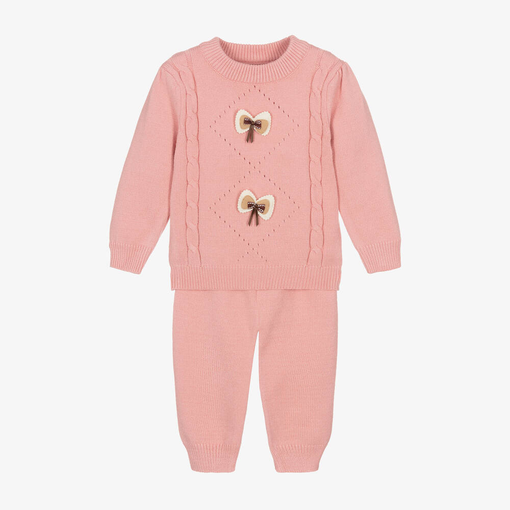 A charming pink trouser set for baby girls by Beau KiD, knitted in a soft viscose blend. The sweater has classic cable stitch and pointelle detailing, with pretty beige and ivory bow appliqués. The matching trousers have an elasticated waist for comfort and easy pull on.