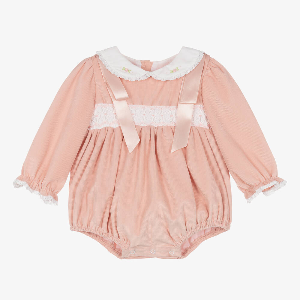A traditionally styled pink shortie for baby girls by British brand Beau KiD. It features a white smocked panel across the chest, with a white Peter Pan collar embroidered with pretty pink roses and trimmed in white crochet lace. There are satin ribbon bows on the shoulders and the puffed long sleeves have frilly lace cuffs. Woven in soft velvet with a fine waffle pattern, this lovely babysuit is lined in lightweight voile for comfort, with buttons and poppers for fastening.