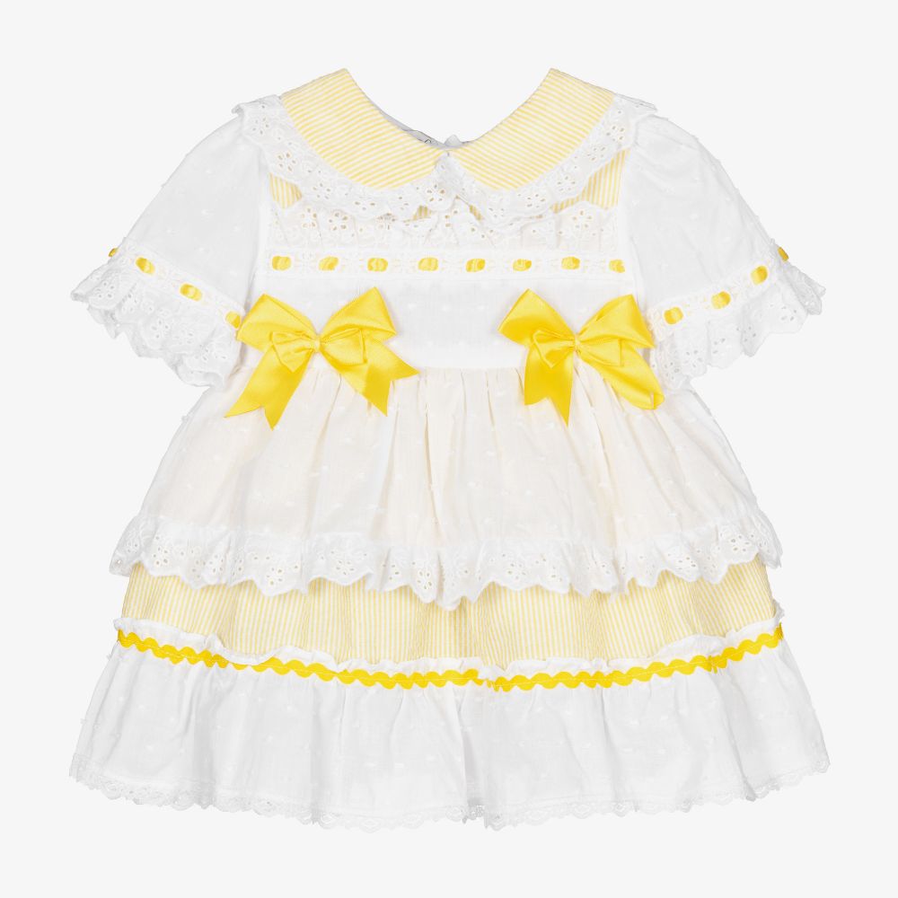 Pretty yellow and white striped dress for baby girls by Beau KiD, made in lightweight cotton seersucker with yellow satin bows. Trimmed in lace, it has a white plumetis voile overlay on the bodice, with a matching hemline and sleeves.