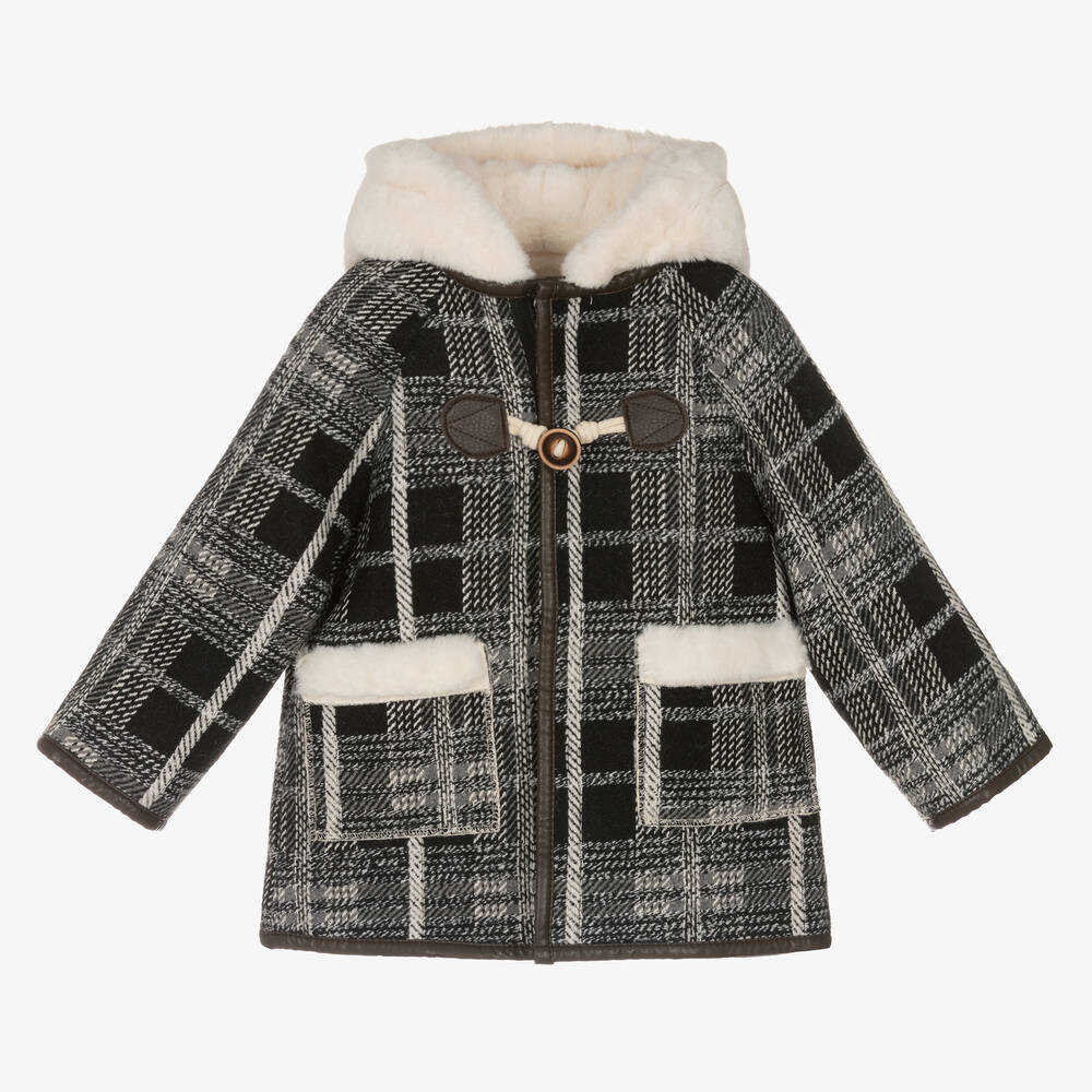 Designed in a black and ivory check, this stylish coat for boys by Beau KiD, has brown, faux leather detailing. Softly brushed, it has a warm and cosy faux fur lining and hood, with matching trims on the front patch pockets. Adding a traditional touch, there is a toggle-style button on the front and a neatly concealed zip fastening.