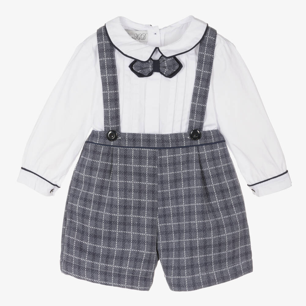 Traditional blue shorts set for little boys by Beau KiD. The long-sleeved white cotton shirt has a sweet collar, pintuck detailing, and a fixed bow-tie on the neck. There are button fastenings on the back and cuffs, and contrasting navy blue piping for a classic finish. Fully lined, the shorts have braces that fasten with buttons on the front, and a comfortable elasticated waist.
