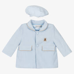 Pale blue with beige trims, this traditionally styled coat and cap set for baby boys is by Beau KiD. Made in soft fine corduroy, the coat is lined in silky satin and the flat cap in lightweight voile with an elasticated back. The coat is lightly padded for warmth and has faux flap pockets and front button fastenings. There are stylish elbow patches, with a sweet embroidered teddy on the chest adding a cute and classic touch.