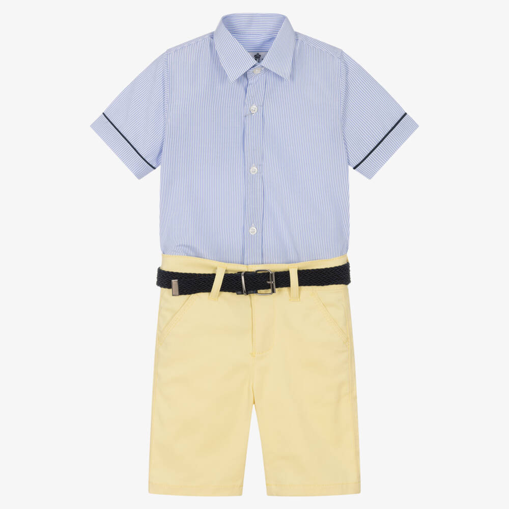 Boys blue striped shirt and navy blue shorts set by Beau KiD. The shirt is woven in a soft and lightweight cotton blend and has a pointed collar, blue trims, and front button fastening. The smart shorts are Bermuda length and come with a plaited belt that has a buckle fastening. They fasten with a button and zip and have belt loops, side slant pockets and faux pockets on the back.