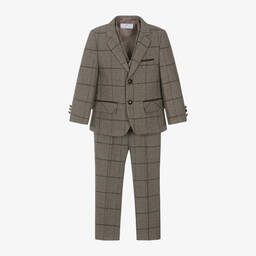 A smart ivory suit for boys by Beau KiD, made in a soft twill weave with embroidered floral detailing. The single-breasted blazer has a sophisticated shawl lapel and decorative, fabric-covered buttons on the cuff. These complement the matching floral waistcoat, styled with neat front pockets and an adjustable cinch on the back. Plain trousers are partly elasticated on the waist and fasten with a concealed zip and button. A coordinating bow tie completes this special occasion look.