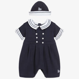A lovely pale blue and white shortie and hat set for baby boys by Beau KiD. Made in soft and stretchy cotton jersey, the coordinating pieces have embroidered stripes and a sweet rocking horse.