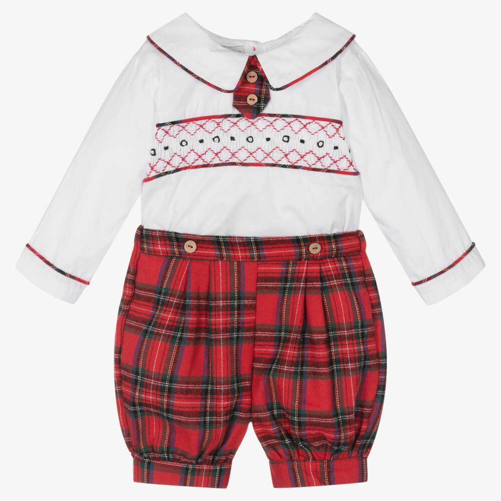 Traditional white and red tartan buster suit for baby boys from Beau KiD. The cotton shirt has a smocked panel with tartan trim and delicate embroidery across the chest. Sweet wooden buttons on the back make dressing easier and on the front two buttons fasten to the shorts to ensure the shirt remains tucked in. The twill shorts are red tartan which match the shirt trims to complete the look.