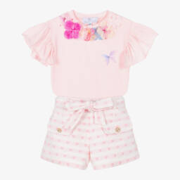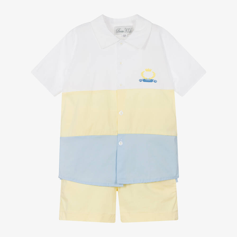 A casual cotton shorts set for younger boys by Beau KiD, in white, yellow and blue. Easy to wear, the short-sleeved shirt has a pointed collar and front button fastenings. A logo design is embroidered on the chest. The matching shorts have an elasticated waistband and slanted pockets on the hips. There are hidden velcro pockets on the legs with light blue tabs and buttoned detailing on the back.