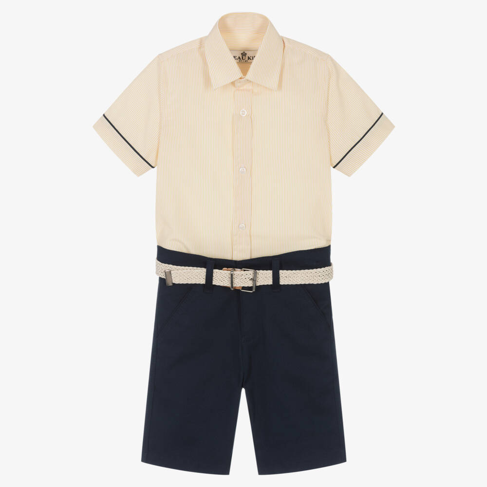 Boys yellow striped shirt and navy blue shorts set by Beau KiD. The shirt is woven in a soft and lightweight cotton blend and has a pointed collar, blue trims, and front button fastening. The smart shorts are Bermuda length and come with a plaited belt that has a buckle fastening. They fasten with a button and zip and have belt loops, side slant pockets and faux pockets on the back.