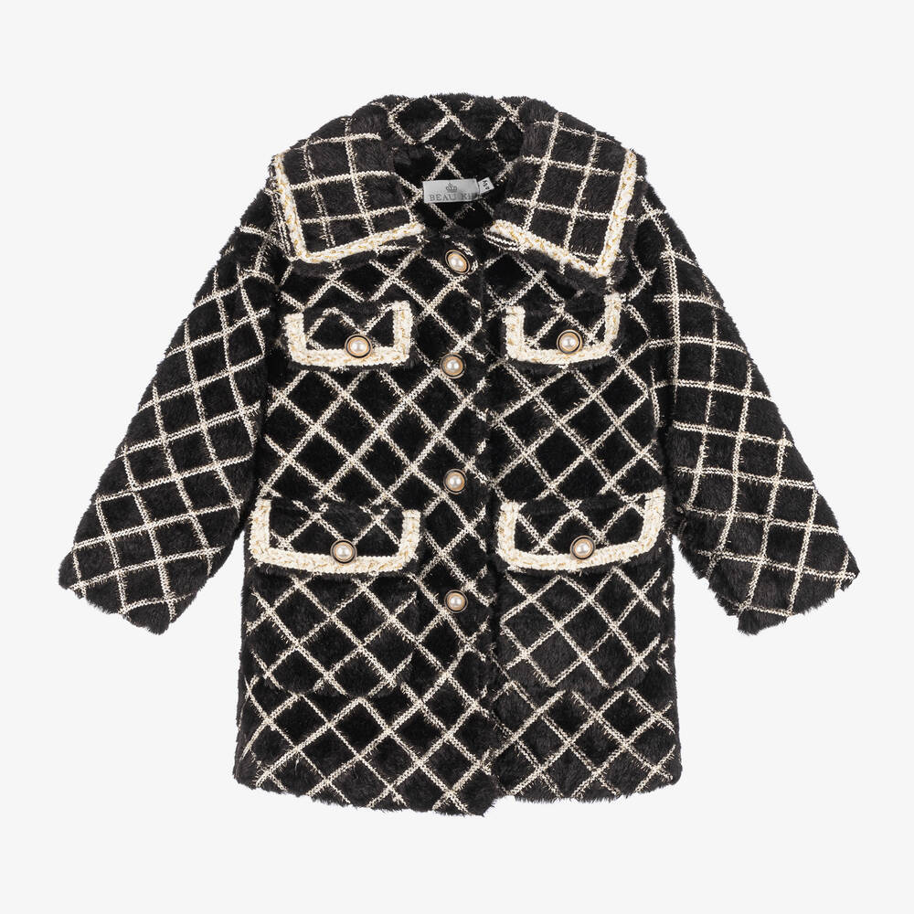 A gorgeous black coat for girls by Beau KiD, made in soft and cosy faux fur, with a silky satin lining. Ideal for cooler days, it has an ivory check design, with glittery gold threads adding a lovely touch of sparkle. Fastening with pretty, faux pearl and gold buttons, it is styled with a smart collar, front pockets and faux chest pockets.
