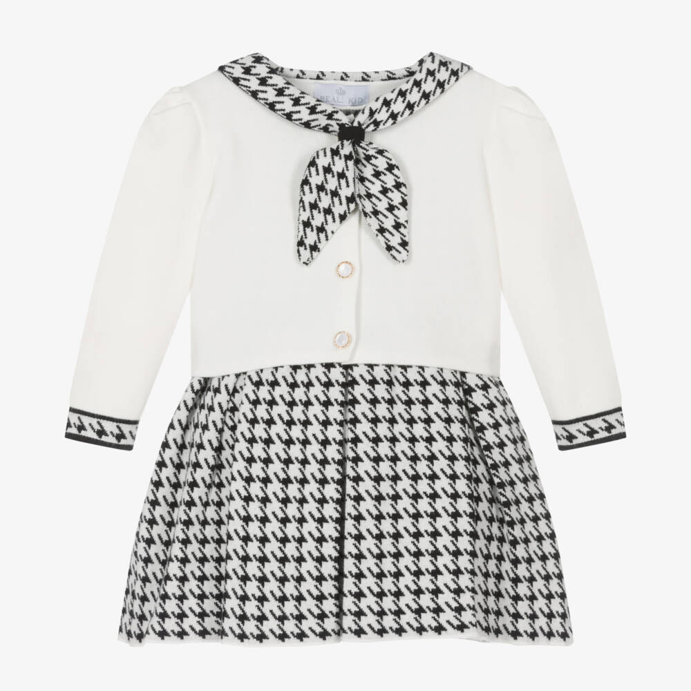 Smart two-tone black and ivory dress set for girls by Beau KiD, knitted from a soft viscose blend. The lovely dress has a houndstooth pattern with a pleated skirt. The cardigan has a matching patterned sailor collar and cuffs, with pearlescent buttons fastening for a luxurious touch.