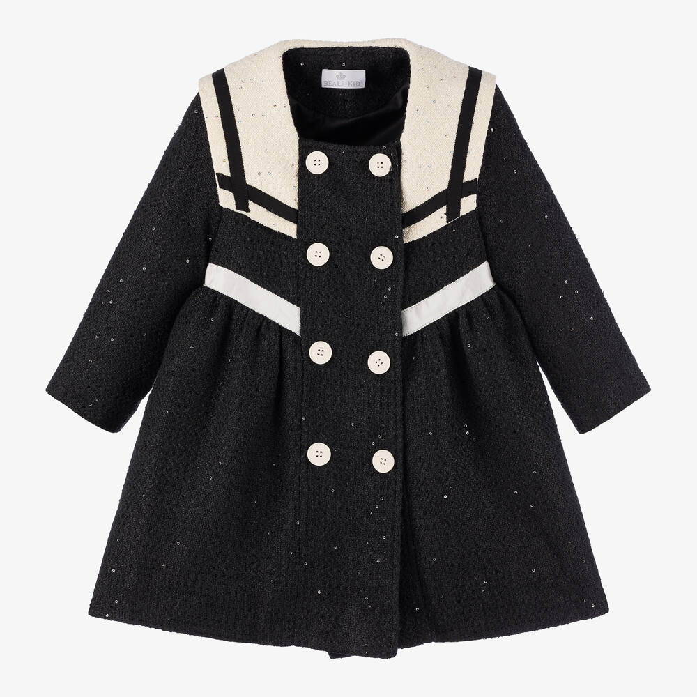 An eye-catching black and ivory coat for girls by Beau KiD, made in soft and lightweight tweed with a smooth satin lining. Woven with sequins for a subtle sparkly touch, it has a stylish sailor collar, ivory grosgrain ribbon trim, and double-breasted button fastenings.