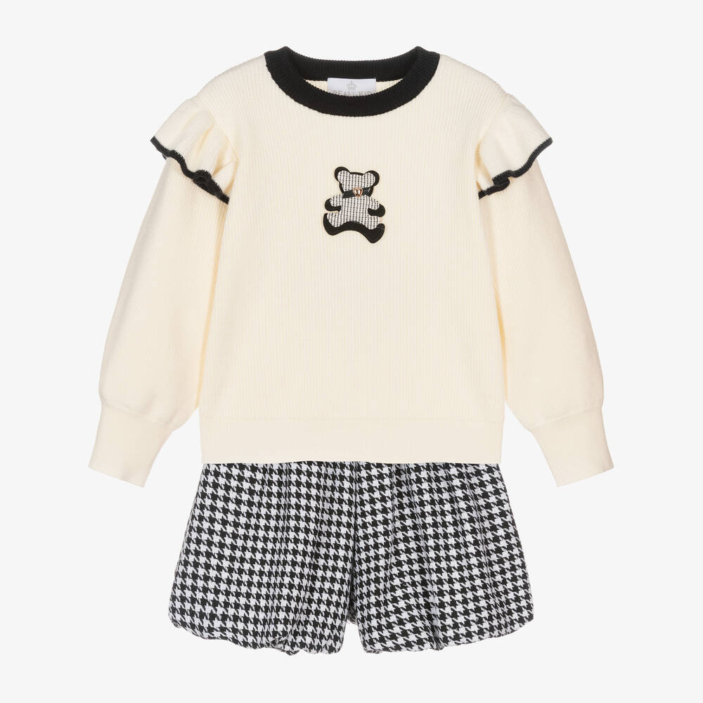 Sweet ivory and black sweater and shorts set for girls by Beau KiD. The ivory sweater is knitted in a soft, mid-weight viscose blend with black trims and ruffles over the shoulders. There is a cute black and ivory 3D teddy appliqué on the front with a gold heart charm. The black and white houndstooth check shorts are made in softly woven fabric with full, balloon effect elasticated cuffs and an elasticated waistband.