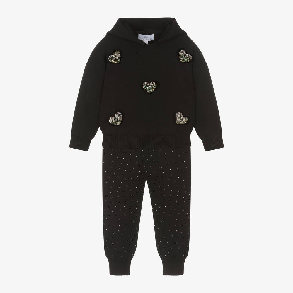 A lovely black hooded tracksuit for girls by British brand Beau KiD. Cosy and comfortable, it is knitted in a soft viscose blend with ribbed trims. The top is appliquéd with fun 3D hearts on the front, sparkling with iridescent diamanté. The trousers have an elasticated waist and, completing the look, they are embellished with sparkling diamanté on the front.