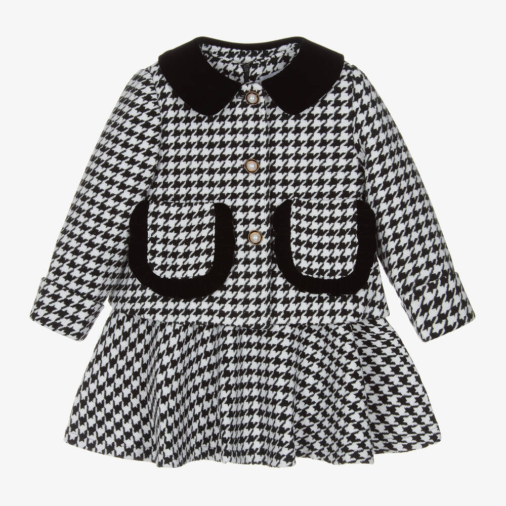 A smart, traditional black and white houndstooth dress set for girls by Beau Kid. Soft and mid-weight, with a brushed feel, the dress can be layered with a blouse or sweater, and has a swirling, flared skirt. It comes with a matching jacket, stylishly trimmed in black velvet. It has large, lustrous pearl bead button fastenings and useful front pockets.