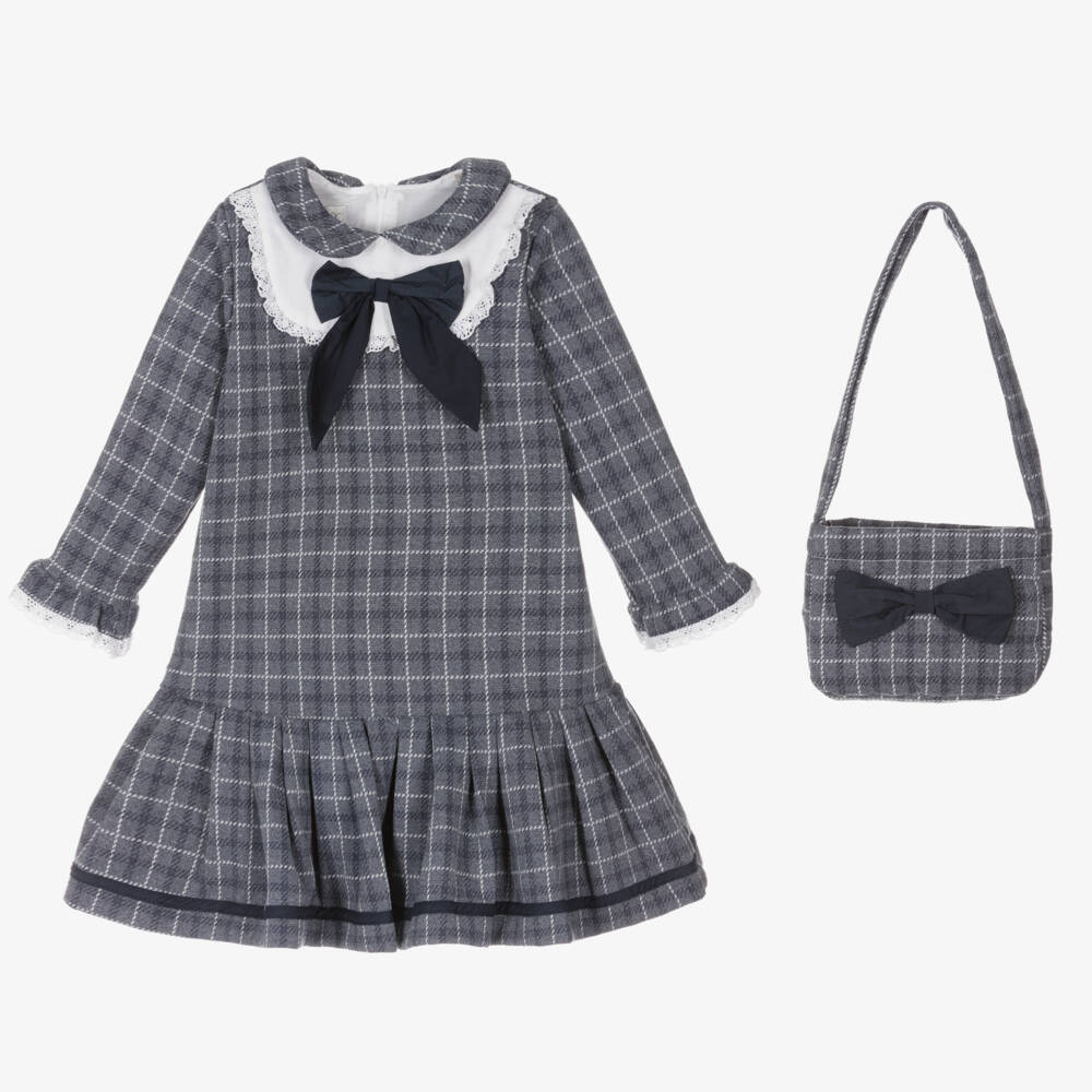 Classically styled, a blue check dress set for girls by Beau KiD. Soft and midweight, the dress has a sweet collar and a white lace-trimmed bib front with a navy blue bow. Fully lined for comfort, there is a dropped waist pleated skirt with blue ribbon trims, three-quarter length sleeves, and a concealed back zip. A matching shoulder bag with bow trims completes this traditional look.