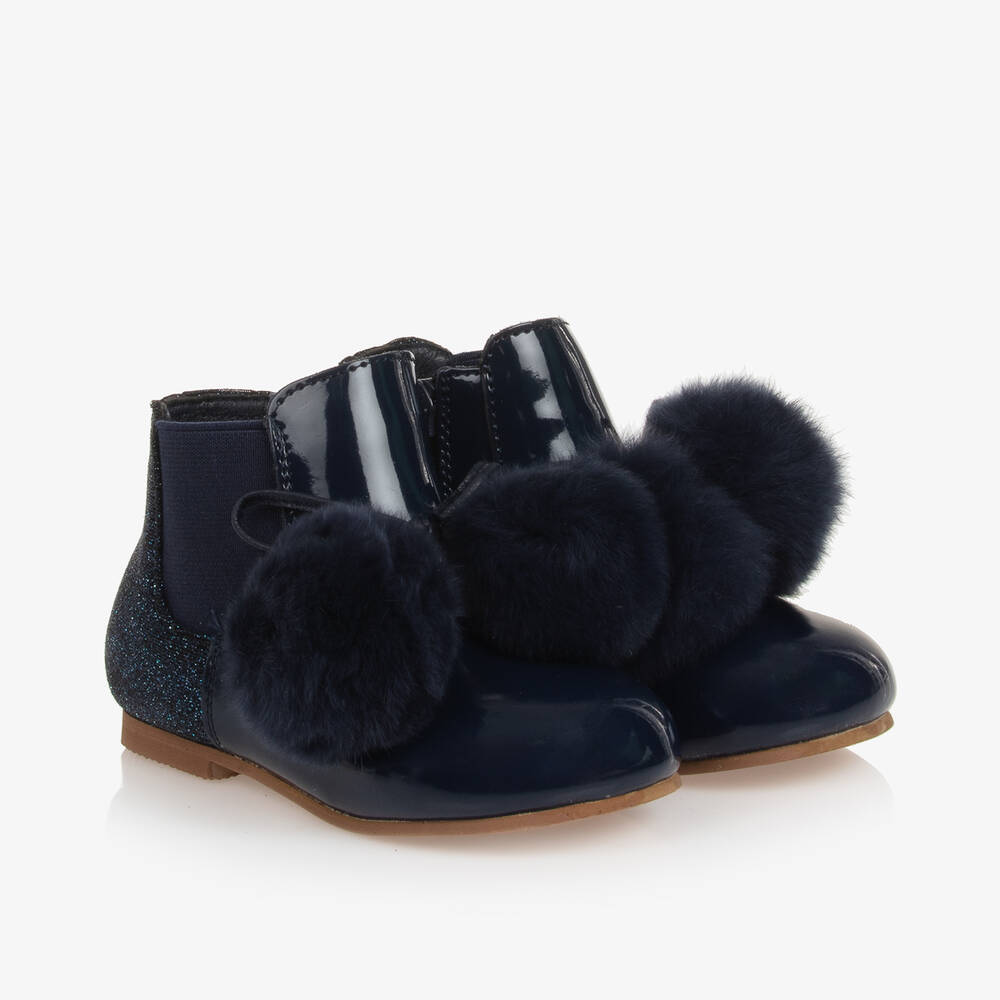 Sweet navy blue boots for girls by Beau KiD, made in soft patent leather. Lined with a cosy plush insole, these smart shoes have a glittery back and oversized plush pom poms on the front. The outer sole helps with grip, and they fasten with a smooth zip on the side for easy dressing.
