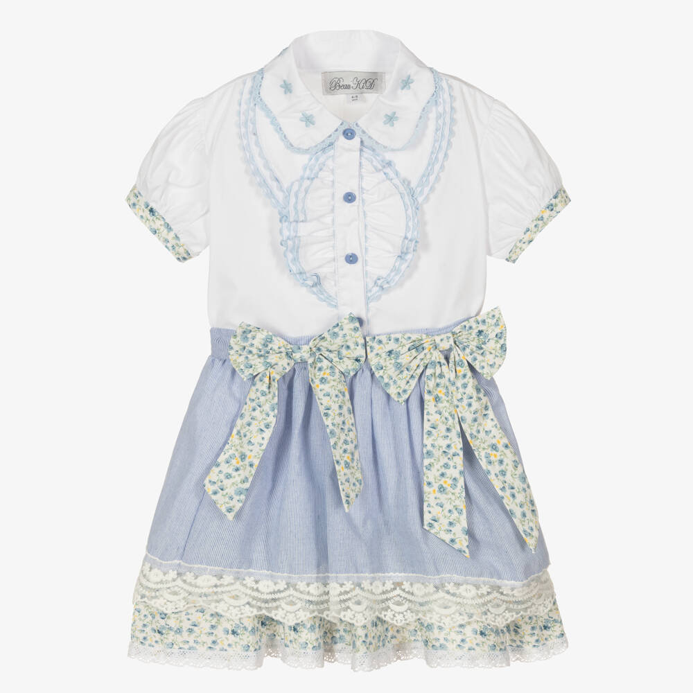 A lovely traditionally-styled white and blue skirt set for girls by Beau KiD, made in soft cotton. The blouse has feminine ruffles and ric rac trims, with pretty yellow and blue floral-patterned cuffs on the elegant puffed sleeves. With a striped upper layer and a floral-patterned underlayer, the full skirt has delicate lace trims and two stand-out matching bows on the front.
