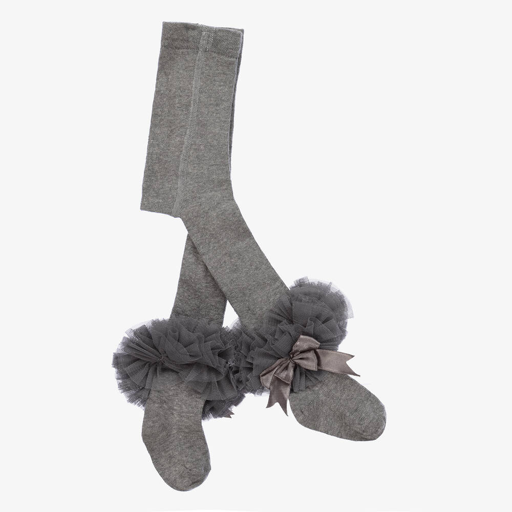 Girls grey cotton tights by Beau KiD, with tulle ruffles and satin bows on the ankles.