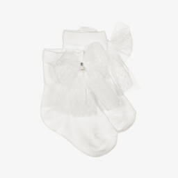 Pretty, ivory cotton-rich ankle socks for little girls by Beau KiD. Soft and stretchy, each has a cute frilly tulle trim and a satin bow.
